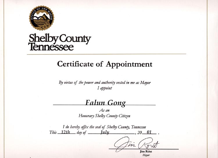 【明慧网2001年11月15日】田纳西州雪尔贝郡(Shelby County, Tennessee)市长于2001年7月12日宣布法轮功为雪尔贝郡荣誉公民。
