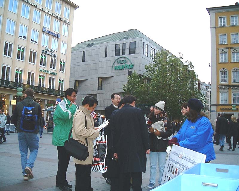 【明慧网2001年11月16日】11月10日是一个星期六,为了让更多的世人了解大法及大法在中国受迫害的真相,慕尼黑的弟子们早在几个星期前就申请了这一天在市中心进行洪法。在快到周六的时候,我们忽然了解到中国国家副主席胡锦涛将在11月10日到慕尼黑访问,这里将是他欧洲五国之行的最后一站。在得到这个消息,慕尼黑的弟子们立刻决定要利用这个机会,在慕尼黑组织和平请愿,向中国国家领导人表达我们海外弟子的心声,停止迫害法轮功,还法轮功以公正!