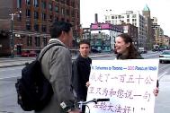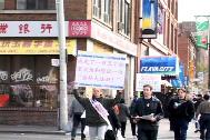 步行者们高举标语走过中区唐人街,克里思婷的标语上用中文写着:我步行一百五十公里走到这里只为向您说一句:法轮大法好!