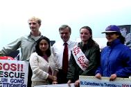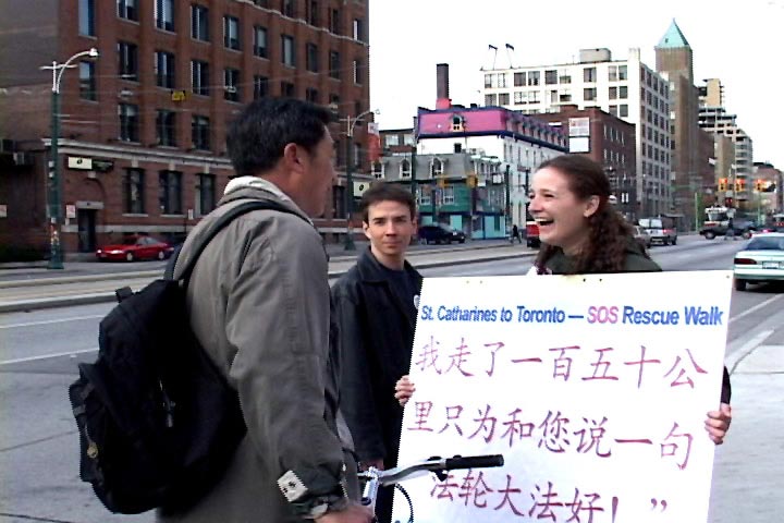 在多伦多大学,步行者们受到热情欢迎,学生会主席和校报总编辑赞扬了他们的勇气和责任感,学校报纸电台记者作了采访。莱尔森大学是步行的最后一站,副校长乔顿先生和学生会主席澳第里亚一道参加了欢迎,并合影留念。欢迎式后,学校报纸对步行者们作了详细采访。