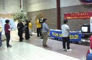 展览中,来要求学功的,询问的,和索取资料的人络绎不绝,其中还有不少人是来参展的摊位主人。有一位美国妇女走到摊位前,学员刚想向她介绍法轮功,谁知她却一摆手对我们学员说:“你不用介绍了,我一直在在那边注意地看你们炼功,你们发出的能量那么强,这个功简直太神奇了,我能不能买一盘教功带?”当学员告诉她这是样品不卖时,她脸上露出了非常失望的表情。为了不让她失望,学员就跟她说,如果她实在想要买可等展览结束时再来。