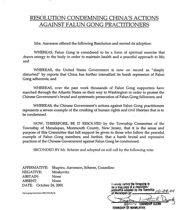 因此,现在,新泽西州,蒙茂斯郡曼纳拉潘市政府议会决议,全力支持以和平的法轮功修炼者为楷模的人们,并进一步谴责中国政府对法轮功的野蛮镇压与迫害行为。