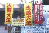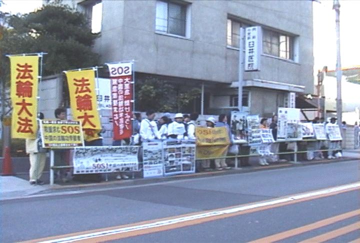 于此同时,其他学员都在发正念排除干扰,警察走开了。过了一会儿,这名警察又回来了,但态度与前大不一样,带着请求的口气说:还是把旗拿下来吧,学员意识到日本警方肯定受到中国大使馆的压力,如果太僵持了也不行,于是便说:现在快中午12点了,就让我们打到1点吧。警察痛快地答应了。学员们望着这三面大旗在阳光下份外耀眼,心想:这金光闪闪的大法大旗,怎么能就这样拿下来呢?现在眼前发生的事情,不就是对我们的考验吗?对法坚定不坚定的考验吗?如果我们不动心,还有什么常人的事情能动摇我们。于是大家再一次齐发正念,铲除邪恶的干扰,让“法轮大法”的大旗在中国大使馆前飘扬。