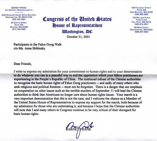 我写此信表示赞赏和钦佩你们对人权的付出以及你们坚定不移地用一切你们能做到的和平方式来停止你们的同修在中华人民共和国所遭受到的迫害。中国当局一再拒绝承认法轮功修炼者及其他许多寻求信仰和政治自由的人士的基本人权是绝不能被遗忘的。目前有一个危险,就是我们强调在其他问题如九月十一日恐怖谋杀问题上合作将导致中国当局以为美国人民不再关心人权问题了。你们的长途步行是一个非常重要的证明,不会是这种情形。而且作为一名美国国会议员,我欢迎这一机会用来表示我对步行的支持,因为我钦佩那些参加步行的学员,同时也因为我希望中国当局将注意到我和其他许多美国国会议员会继续对他们漠视基本人权的严厉谴责。