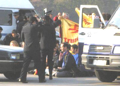 美联社11月20日图片编注:右上图及上图美联社图片中的白人青年即为本文的作者。他於2001年11月20日下午走上了天安门广场,打出“法轮大法好”的横幅,并用汉语向周围的中国人大声喊道:“全世界都知道法轮功好!加拿大知道,欧洲知道,美国知道!”……