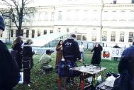 第二天当我们到达展位时,才发现我们的桌子和椅子都不见了。询问工作人员,才知道对面的食品摊主嫌我们吸引了太多的注意力,怕影响到他们的生意,就要求把我们迁走。工作人员抱歉地对我们说,桌子移到了草坪的另一侧,如果我们要求,他们可以再把桌子搬回原地。考虑到搬回原地可能会影响到整天的洪法活动,加之新的位置也很开阔,我们就顺其自然接受了新的安排。工作人员从远处引来了电源,供我们放电视。