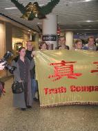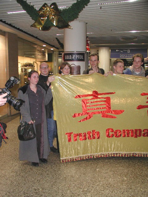 会上学员介绍了他们北京之行的目的,意在唤起世界公众和各国政府对中国政府镇压法轮功的关注,并能挺身而出支持正义。学员们讲述了他们自20日下午一时许在天安门广场展开“真善忍”横幅后20个小时内的经历:强行被警察塞入警车,带到警察局,逐入暗无天日的地下监狱,无论男女学员,都被警察任意粗暴推搡拖拉,全然不顾学员的抗议。随后他们又被带到一家旅店,关进一大房间内。四周警察严密监视,上厕所要两个警察陪同,而且不许关门。他们被多次盘问,被要求在一些中文文件上签字,遭到拒绝后,部分学员遭到殴打。这样一直持续到凌晨四五点钟,警察都累得睡着了。北京时间21日上午11时,这8名德国学员和4名瑞士学员被直接从该旅馆押至机场,送上飞往法兰克福的航班。