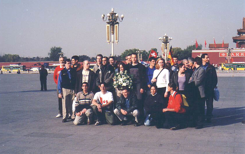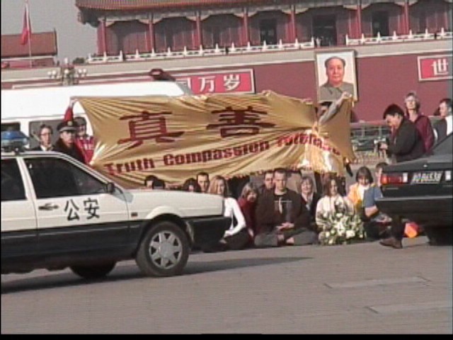 面对和平安祥的西人法轮功学员,中国警察没敢象对待中国人那样拳打脚踢,也知道不该把西方人当成自己练拳脚泄私愤的工具,但他们太习惯于使用暴力和欺侮他人了。上图是那面写着“真善忍”三个大字的横幅遭警察撕扯的一瞬间情景。