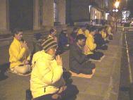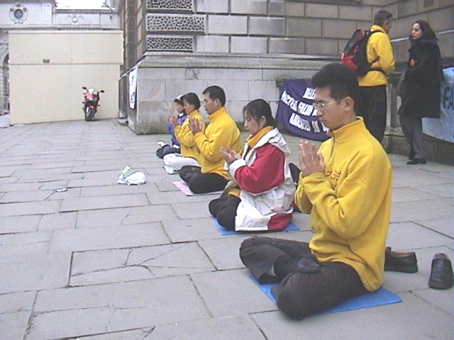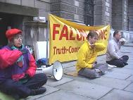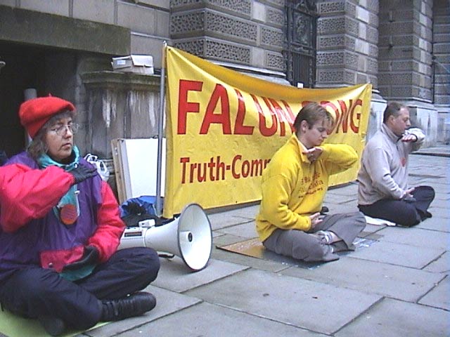 会议期间,在英国外交部门前,英国学员挂起了“法轮大法”、“真、善、忍”、“紧急救援受酷虐的中国法轮功学员”、“撤销610”、“法办罗干”等横幅。并向路人散发大法资料。一些曾对法轮功有误解的人,看到大法弟子纯正的心态,祥和的炼功,不由得对大法弟子产生敬意。有一位基督徒途经这里,本来对大法弟子有些误解,当他取走了我们的资料后,第二天特别来到大法弟子炼功处,拉着一位学员的手说:“我误解你们了,没有想到中国的法轮功学员遭受如此残暴地酷刑之下,你们还能这么祥和。”他知道当日在场和平请愿的学员大多都没有吃饭,执意要请学员吃饭,被我们婉言谢绝。学员们为多一个人知道真相而欣慰。