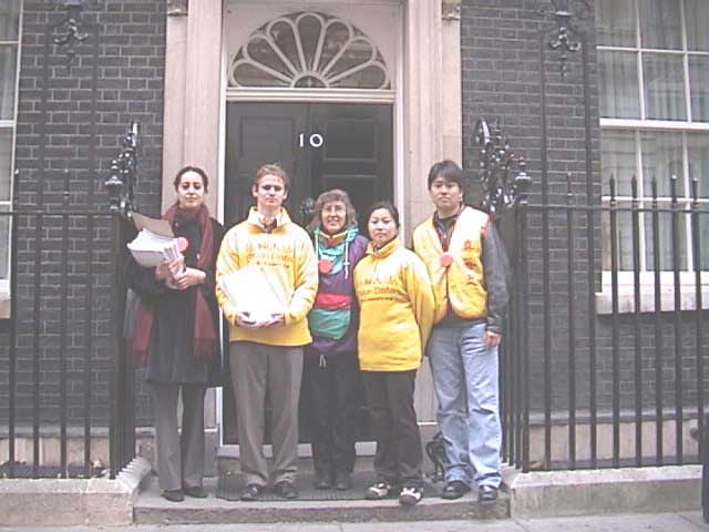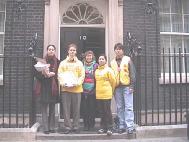 | 英国学员在伦敦外交部门前炼功 | 英国学员在伦敦唐宁街十号首相府递交有一万多人签名,要求紧急救援中国法轮功学员的请愿信 |