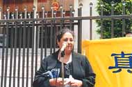 一位来自中国大陆的曾被劳教一年的法轮功学员也作了简短发言。她说作为中国人,她为起源于中国的法轮大法在世界上得到如此广泛的传播和认同而感到骄傲,同时又为中国的法轮功学员不但得不到自己的政府的保护、反而受到自己的政府的迫害,而现在居然需要外国的同修来为他们请愿而感到悲哀。是结束这场残酷迫害的时候了。