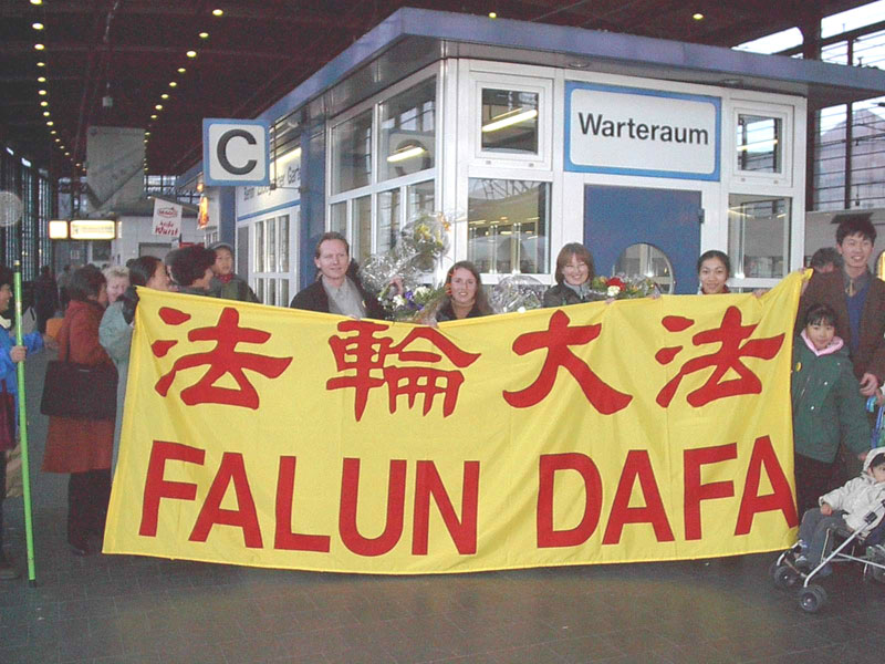 三名来自柏林的德国大法弟子昨天从法兰克福坐火车回到柏林,当地的许多学员去迎接并在附近举行了记者招待会,在火车站他们再次展开中德文的“法轮大法”大型横幅。与会记者听取了他们在中国的经历,德新社的记者详细询问了每一个人的情况。