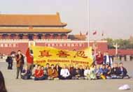 2001年11月20日消息,36名西人法轮功学员北京时间11月20日下午2时许在天安门广场打出“真善忍”横幅为法轮功进行和平请愿,数分钟后全部遭到中国警察逮捕。