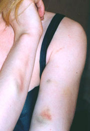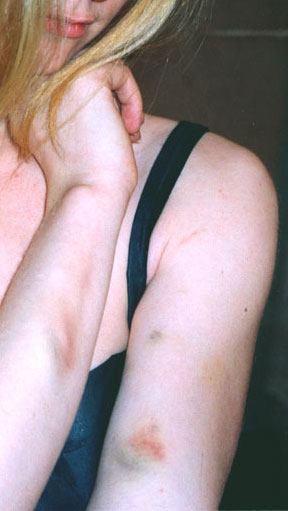 【明慧网2001年11月26日】请看,这就是江泽民集团对在天安门广场和平请愿的西方法轮功学员的“人道”待遇。这是法国学员海伦.佩蒂(Hélène PETIT)被天安门广场恶警殴打,四天后仍清晰可见的伤痕。