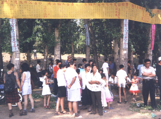 第二天,我们又拿着真相传单来到渡口派发,那天人特别多,能有1千多人。大家都被大法的洪大慈悲所感化,为眼前的庄严场景所震撼。很多人驻足观看,有的低声议论。一个同修一边给大家念大横幅上的内容,一边做一些讲解,有的同修向游人派发真相材料。一个中年人跟同伴说,“今年这一趟可真没白来,法轮功学员给咱上课来了,要不,我还真不知道是咋回事呢。只听广播、电视每天讲个不停。通过这一课,嗯,多少品出点滋味来了,原来广播、电视都是造谣哇!”一中年游客举起相机,拍下了一张张珍贵的照片。