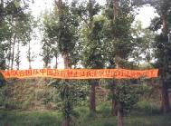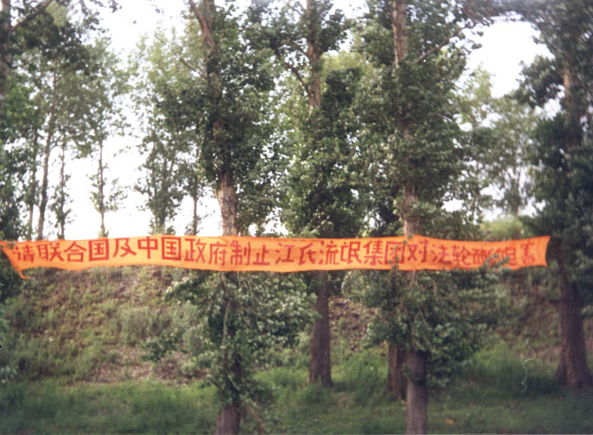 正巧赶上附近的大江这二年兴起了旅游,每年端午节都有不少游人。我们悟到这是讲清真相的好机会,就联络附近两个县的功友做了好几宿条幅、不干胶、传单、气球,初四那天晚上布置了一道,树干、江堤、船只,特别在人流最集中的渡口处挂了一个14米长的金黄色大横幅,上面写着“法轮大法好、还我师父清白”等大字,还有同修写的劝世篇和警世言。同时,我们还在大横幅附近的树干上挂了很多五颜六色的小条幅。大小条幅相映成辉,真是一派圆融祥和的景象。