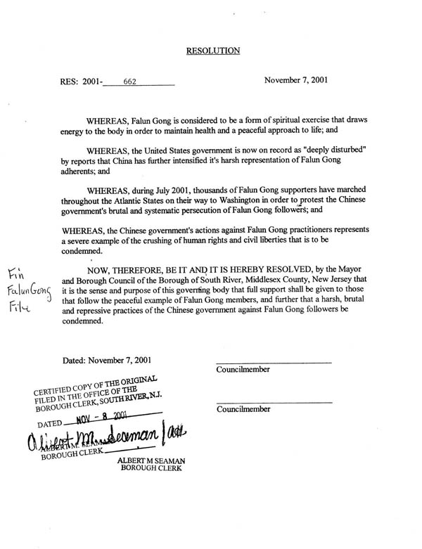 为此,新泽西州密豆县南河自治市市长和市议会决定,本政府全力支持那些遵守和平准则的法轮功成员,并谴责中国(江泽民)政府对法轮功追随者的粗暴、残酷、镇压的行为。