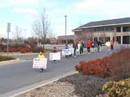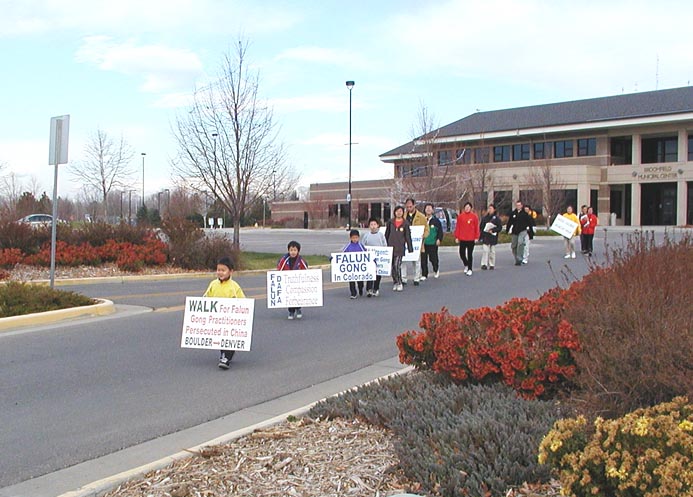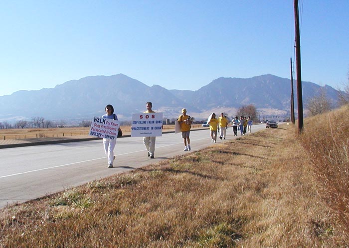 步行的那天,十一月十七日一早,大家就聚集在波德尔市中心的广场上。在这里,我们举行了“紧急救援步行”的新闻发布会。十点多钟,弟子们在悠扬的大法音乐伴随下,展示了五套功法。有两家报社(“科罗拉多州每日新闻”和”每日新闻图片”)的记者对我们进行了采访和摄影。等新闻发布会一结束,我们就戴着大法标语牌,排着整齐的队伍,踏上了“紧急救援步行”的征途。