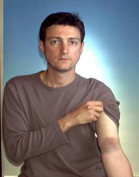 克里斯:好的。2001年11月20日下午2点,我和另外三十多人在北京天安门广场照了几张像后,我们一起展开了一副用中英文写着“真善忍”的横幅并开始打坐。马上就有数辆警车鸣着警笛向我们冲过来。许多警察对我们连踢带打,并不断地企图夺走我们的横幅。最终他们把横幅夺下来了,把我打倒在地上。我问他们为什么这样做。他们没有任何兴趣和我们说话,唯一想做的就是把我们拖入警车。我知道我没做错什么,我不想进那警车。