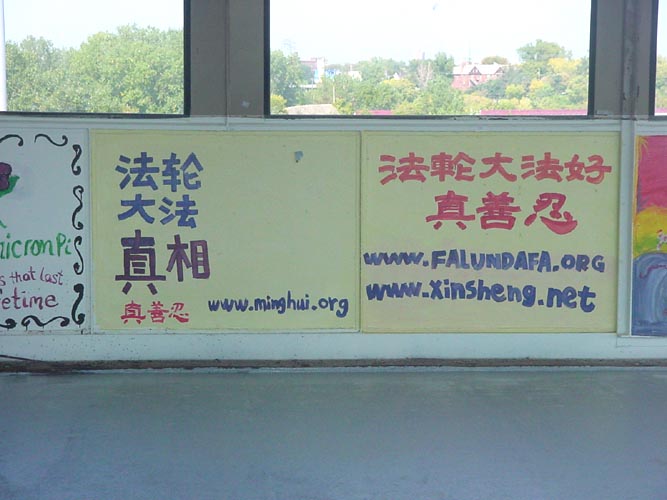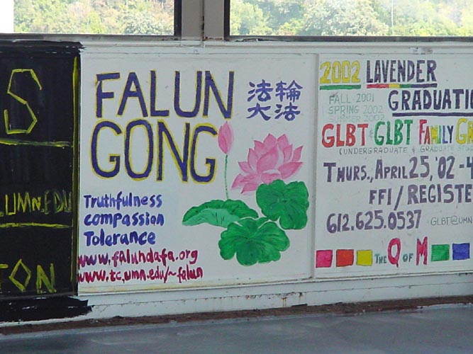 【明慧网2001年11月3日】具有悠久历史的明尼苏达大学是一所综合性大学,著名的密西西比河横穿校园,成了明尼苏达大学特有的一景。连接密西西比河两畔校园的是一座封闭式桥梁,来往行人十分繁忙。桥的两边布满了墙壁绘画,墙壁绘画一般一年更新一次,今年,法轮功宣传画第一次出现在桥两侧的绘画栏上。这使更多的人可以借此了解法轮功,并可从固定在墙壁上的资料筐里方便地索取有关资料。
