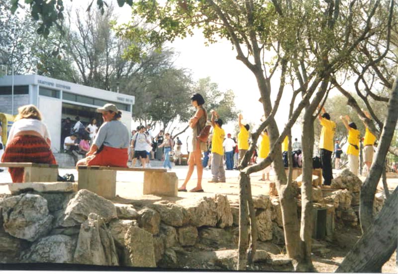 著名的雅典卫城(Acropolis)的售票处是对旅游者展示法轮大法的极好场所。这也许在欧洲是游客最多的旅游点之一。每天都有成千上万的旅游者光临。