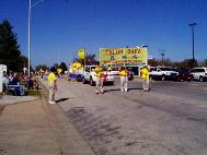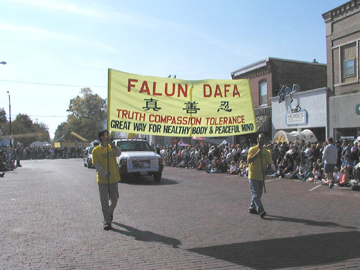 这一天,天气格外晴朗,秋高气爽。当我们随着游行的队伍缓缓前行时,“法轮大法”,“真、善、忍”的大型横幅在阳光下发出耀眼的光芒。两边观阅的人群频频向学员们招手致意,观众们争相传阅学员们派发的大法资料,不时可见纯真的孩子们向我们合十敬礼,一切尽在“缘”中。当队伍进入观阅台,广播中宣布现在步入的是法轮大法的队伍时,人群中报以热烈的掌声。