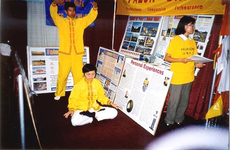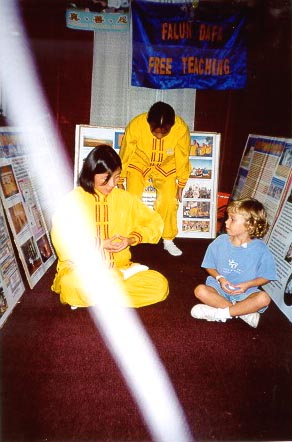 这是一堂采访见习课。我们得到了非常充裕的时间来介绍大法。除了对“真,善,忍”的宇宙法理的介绍,讨论和功法的演示外,在学生提问中,“自焚”的问题又一次被提出来。我们立即放了真相录像带,并留下了《法轮功的真实故事》等其他录像带。接下来,学生对我们一对一地进行个别采访。交谈的内容就更加深入了。例如,他们问到我们每一个人走入大法的因缘及个人的体会,问到我们害不害怕中国政府的迫害,问及我们在中国家人的处境等等。我们每个人都在自己的修炼层次中,尽可能地作了回答。最后,学生们开始学动作。整个介绍活动一直持续到学校关门的时间才不得不结束。