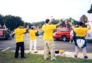最后,资料发完了,弟子们就在游行队伍中回答人们的提问,当队伍停下来等待时,我们就立刻演示一套功法。当游行结束我们往回走时,不停地有人和我们招手,一位西人女士走过来说她没拿到简介,弟子在口袋里又找到一份给了她,她高兴的走了。