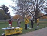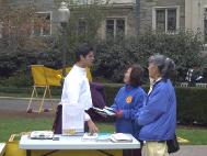 布置好带来的摆放弘法传单,真象小册子和图片集的折叠桌后,有的学员炼功,有的学员派发传单。麦可讲着一口流利的北京话和我们打招呼,他曾在中国留学一年,如果不看见他金发碧眼的模样,我们真的以为他是北京人哪!麦克是学国际关系的,和我们用中文交谈了近半个小时关于法轮功及法轮功在中国被镇压的情况,中英文的大法材料他每样带走一份,他说他将专门研究研究有关法轮功在中国被迫害的课题。