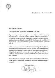 10月29日,丹麦总理鲍尔.纽如普.拉斯坶森在一封给丹麦法轮功学员的复信中表示:欧盟将会继续要求中国政府改善人权现状,“丹麦及其他欧洲同盟国愿意继续并加强这种批评性的对话”。以下是该复信的译文全文。