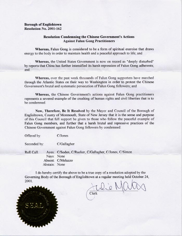• 美国新州英格莉史市通过决议谴责中国迫害法轮功学员