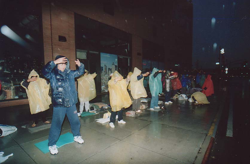 【明慧网2001年12月14日】上星期六(12月8日),纽约市法轮大法学员在中国领事馆前会合,一起发正念。然而当日这座城市正下着一场冰冷的大雨,狂风从哈德逊河上吹过来,直冲42街--学员们在领事馆对面聚集的地方。