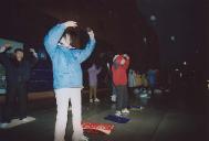 每发完一次正念,我们就炼功,这时我留意到一些令我感动的事情。一位男士既没有手套,也没有雨衣,但他仍然纹丝不动地站立着炼习第二套功法。雨水猛烈地敲打着地面,天气格外寒冷,但是他丝毫没有晃动身体。他的面部保持着平静祥和,从头至尾完成了这套功法。