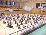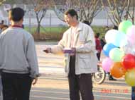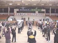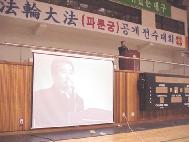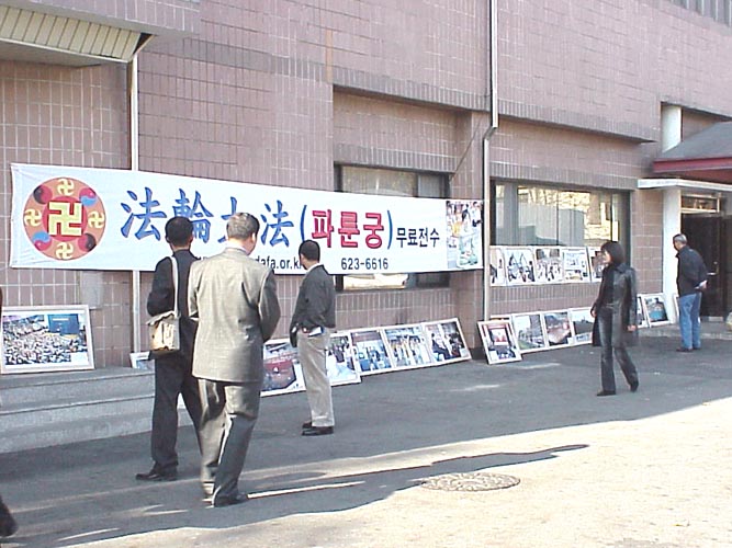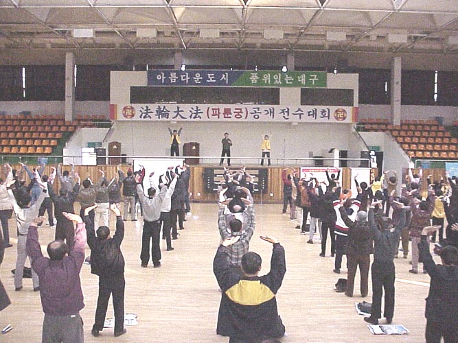 11月24日,百余名大邱学员们老早来到会场,会场门口摆放了一百多幅大法图片,下午2时,慕名而来的150余人都拿着传单和真相材料走进会场.会场内辅导站购置的投影机向大型银幕播放着大法总会编制的真相录像片与师父教功录像带,然后由三名学员向到会的各界人士讲述得法的经过与大法给自己带来的好处。其中有一人的发言博得了多次热烈的掌声。之后,学员们向到会者教功。