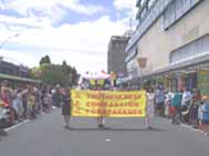 这时我有股熟悉的痛楚,联想起今年初一次洪法活动也是在最后一刻遭到破坏而没能参与。我暗下决心:这次绝不能再让邪恶势力得逞,坚决否定旧势力阻挠众生得闻真相的安排。于是,我们积极行动起来。这时已是星期五的晚上七点半了,上哪儿去找熟识的议员帮忙协商呢?黛安试了所有的电话号码都联络不上他们。接着很幸运地和市长连上线,但刚上任的市长虽然曾经支持过我们的徵签也给黛安回过信表达关切与支持,但他一听到中国政府的残酷镇压后却失去了他当市长前的同情与支持。我立即向他说明我们对政治没兴趣不参与的态度,虽然在中国的确是发生了惨无人道的基本人权受严重侵害的问题,但这里是新西兰,我们数年以来不求名利地服务社区大众,只听到人们对遥远国度的中国学员的关怀与支持,而在中国发生的错误不应该延续到新西兰来。他听后表示他不承诺帮助我们但愿意去了解情况。将近一个小时后,承办单位温蒂来电话告知,他们与市长有了共识,你们只有两个选择,退出游行或不具名参加。我们当即表示这是不合理及错误的决策。