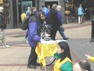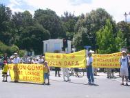 下午6点时分,学员们结束了一天的拜访,前往中国驻美大使馆,正值大使馆为来访的50多位中国高级官员举行晚宴。夜幕中,人来人往,学员们手举中国大陆法轮功学员受迫害的大幅图片,以亲身经历向过往人群及与会代表团高级官员讲述人间最大的悲剧,讲述善良的人在中国受迫害的血泪故事。讲述2年多来无数的法轮功学员用生命讲述的一句真话“法轮大法好,法轮大法是正法”。