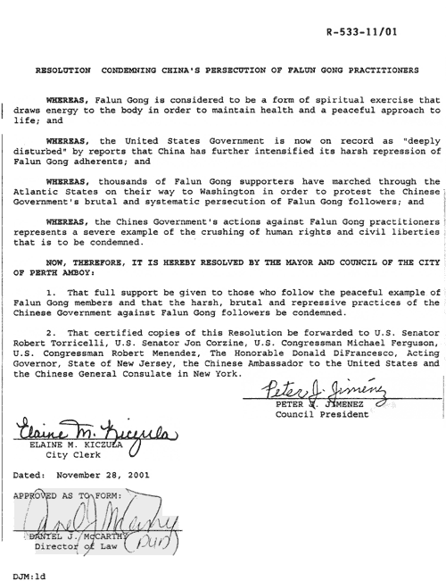 【明慧网2001年12月2日】2001年11月28日,新泽西州波斯安波(Perth Amboy)市的市长和市议会通过决议R-533-11/01号决议,坚决支持法轮功并强烈谴责中国[江泽民集团]迫害法轮功。决议还决定将决议副本送往新州的国会参议员和国会众议员,新州代理州长,中国驻美大使和驻纽约总领事。