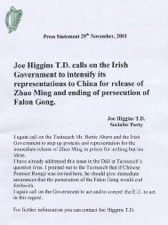 我已经关于此问题在议会总理问答会上提出过。我向总理指出,如果我们邀请中国总理朱镕基访问爱尔兰,他应该立即保证马上停止迫害法轮功。我再次呼吁爱尔兰政府行动起来,并要求欧盟就此问题行动起来。