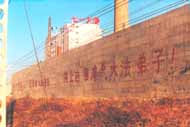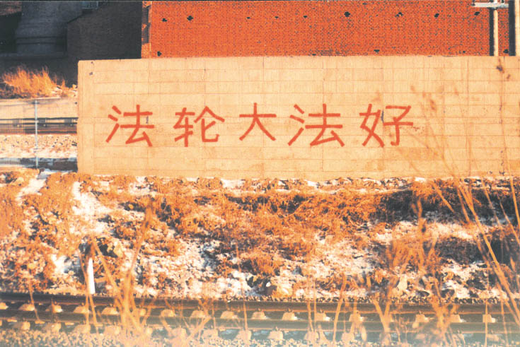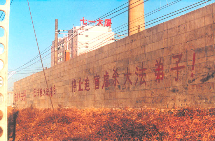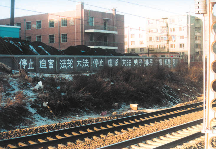 在火车站附近的铁路沿线两旁的墙上,大法弟子在上边工整地写下了“法轮大法好!还法轮大法清白!停止迫害虐杀法轮大法弟子!”,“停止迫害法轮大法!停止虐杀大法弟子!善恶必报!真善忍!”每字约1米见方,更为醒目(见图)。这些字每时每刻都在震撼着旅途中的人们的心。