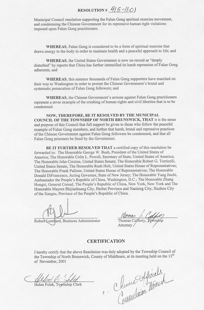 因此,现在,新泽西州,米德赛郡北布朗什维克市政府议会决议,愿意全力支持和平的楷模法轮功修炼者,并进一步谴责中国政府对法轮功的野蛮镇压与迫害行为和要求中国政府释放所有的被关押的法轮功修炼者。