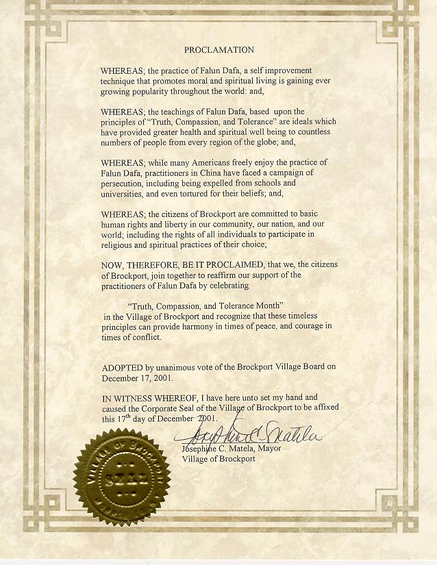 特此宣布,我们,布劳克泊特市民联合起来,庆祝“真、善、忍”月,以重申我们对法轮大法学员的支持,并肯定这些永恒不变的原则在和平时期带来的和谐,在矛盾纷争时期带来的勇气。