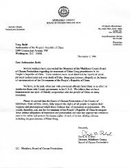 新泽西中塞克斯郡郡委会致信中国大使谴责对法轮功的迫害