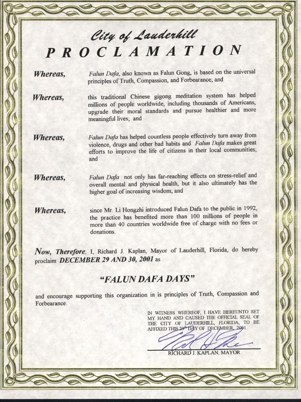 【明慧网2001年12月28日】佛罗里达州劳德希尔市市长理察 J. 开普兰(Richard J. Kaplan)宣布2001年12月29日至30日为劳德希尔市“法轮大法日”。