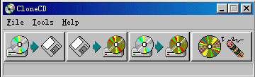 正如界面上图片的意思一样,第一个按钮上的图片意思是把母盘上的文件复制到硬盘;第二个按钮上的图片意思是把硬盘上的文件刻录到光盘;第三个按钮上的图片意思是从母盘直接刻录到新的光盘上;第四个按钮上的图片意思是清除可重写光盘。