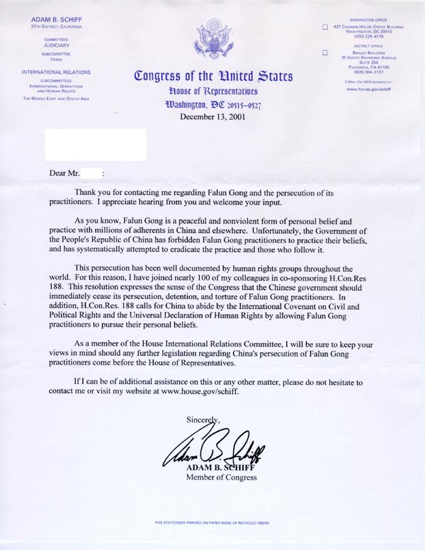 如果我能够在此事或其它事情上帮助你们,请不吝与我联系,或访问我的网址www.house.gov/schiff。