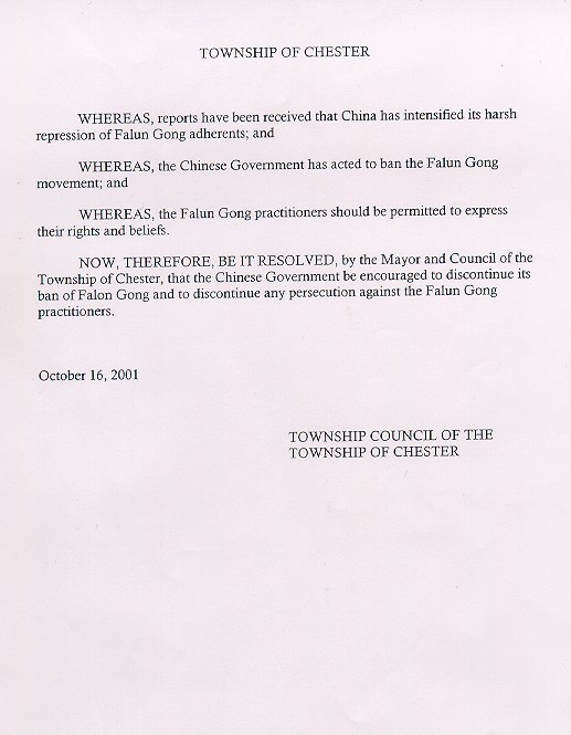 为此,柴思特(Chester)市市长和市议会决定:中国政府应当停止取缔法轮功,停止对法轮功学员的任何迫害。