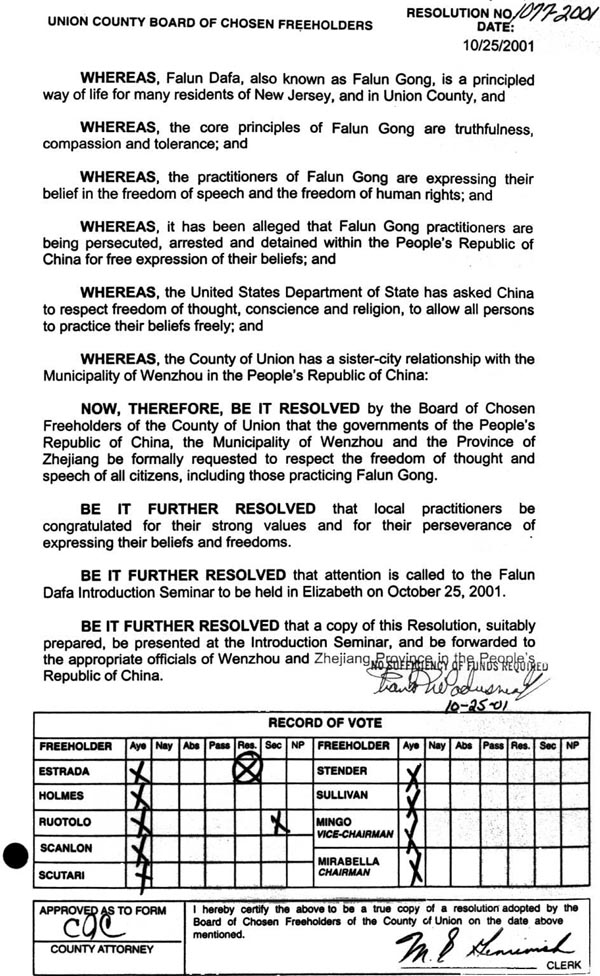 【明慧网2001年12月5日】2001年10月25日,新泽西州联合(Union, NJ)县县议会一致表决通过了第10772001号关于支持法轮功,谴责中国(江泽民)政府对法轮功学员迫害的决议。