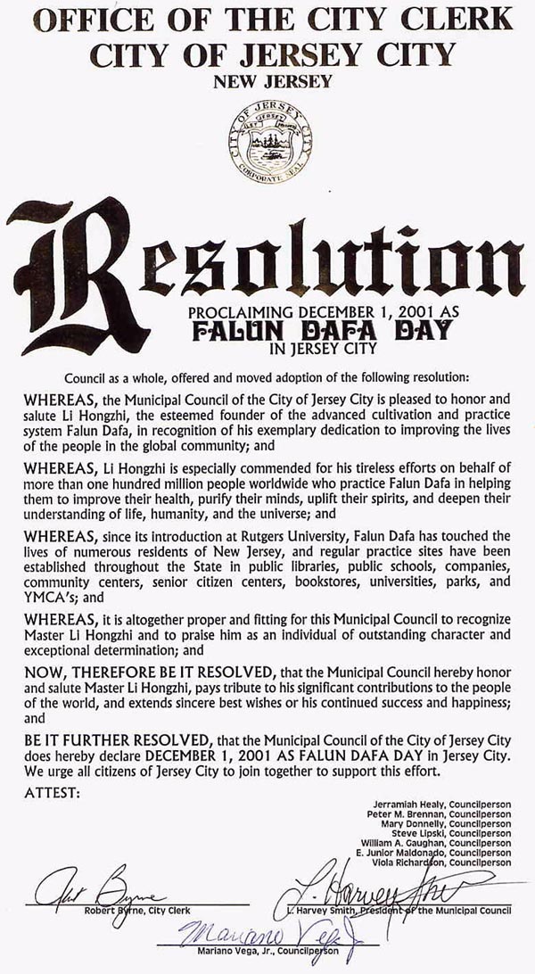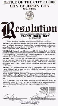 【明慧网2001年12月5日】2001年12月1日,新泽西州第二大城市─泽西市(Jersey City, NJ)市议会通过决议,向法轮大法创始人─李洪志大师致敬,以表彰他为改善全世界人民的生活所做出的出色奉献;同时宣布2001年12月1日为泽西市“法轮大法日”。