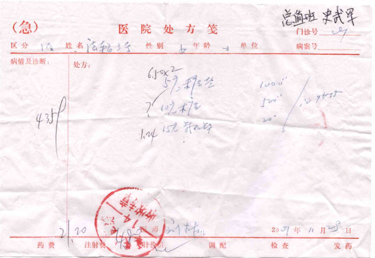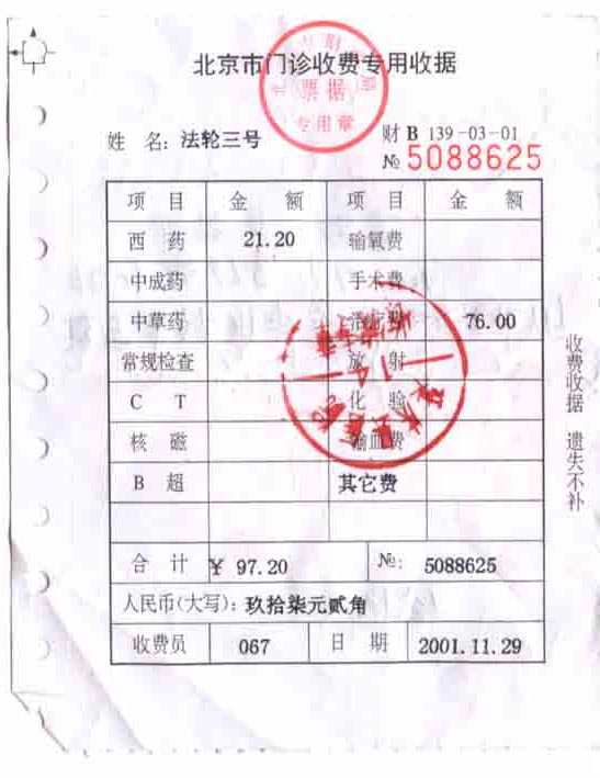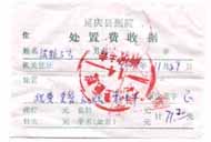 三名恶警用了十五卷纱布(绷带)把我绷在床上,只露脑袋和脖子,要给我打点滴,我不让他们打,护士就在我脚上打,共打了三瓶(后附收据三张)。