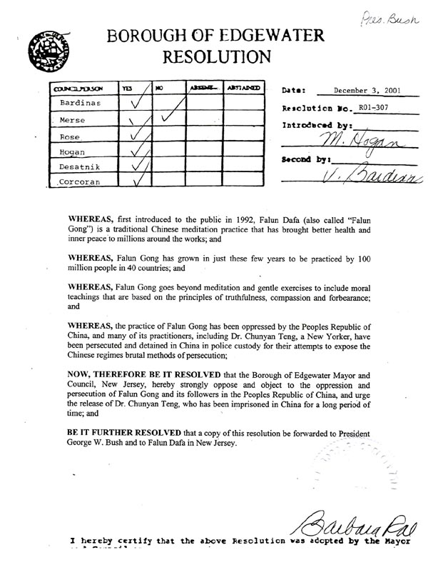 【明慧网2001年12月9日】2001年12月3日新泽西州边水镇(Borough of Edgewater, NJ)市议会通过了谴责中国江泽民政府迫害法轮功修炼者的R01-307号决议。全文如下: